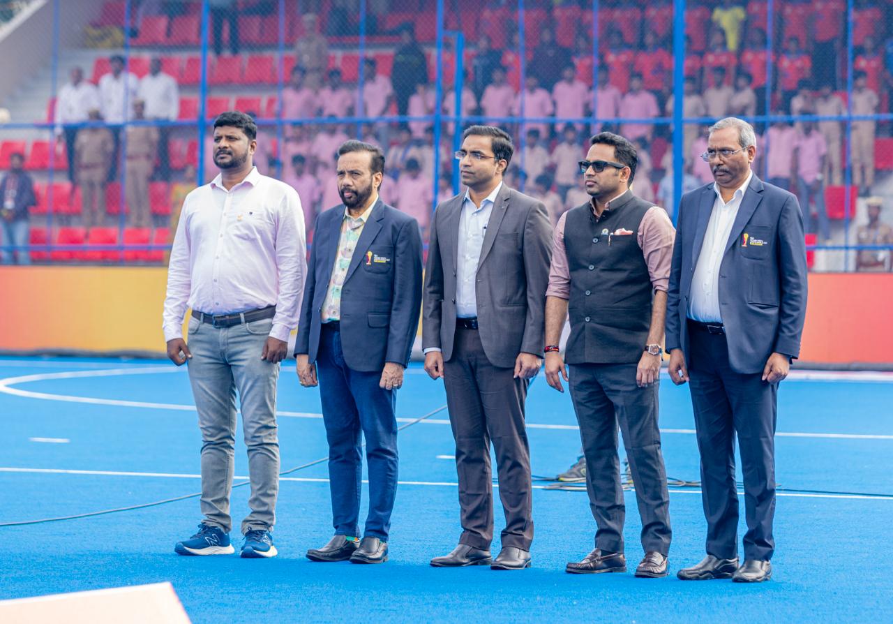 Key moments from the FIH Hockey Men’s Junior World Cup Tamil Nadu 2025, alongside distinguished officials of Hockey India.